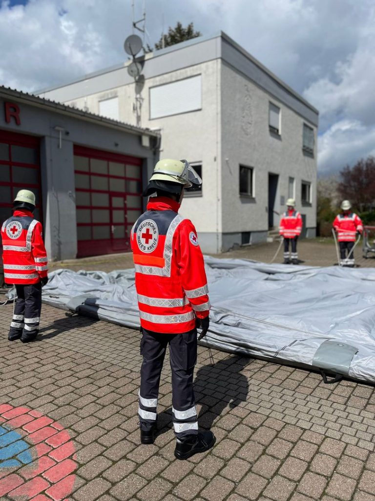 An zwei weiteren Samstagen folgten zusätzliche Pflichtlehrgänge. Im Einführungsseminar setzten sich die Jugendlichen mit der Geschichte und den Zielen der Rotkreuzbewegung auseinander. Im anschließenden Helfergrundlehrgang konnten sie ihr Wissen praktisch vertiefen – vom Aufbau eines Einsatzzelts über den Umgang mit Krankentragen bis hin zu Abläufen an Einsatzstellen.